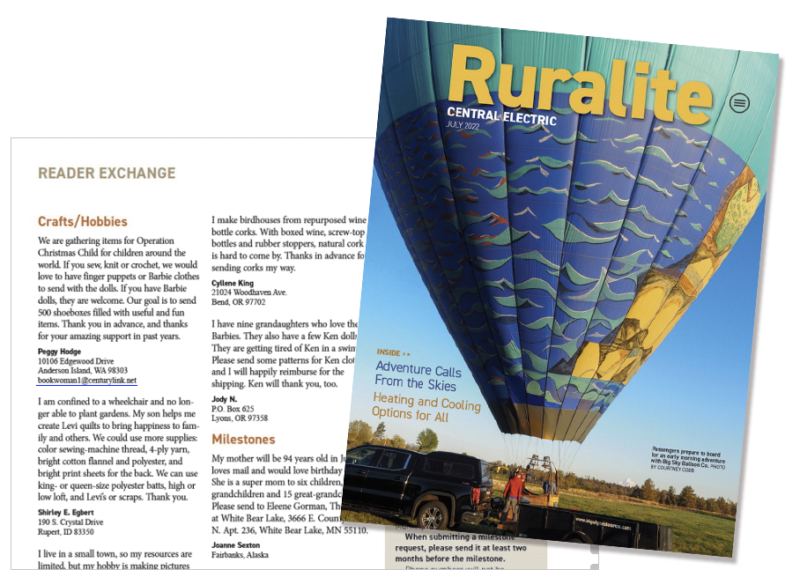 Ruralite’s editorial team receives between 20 and 100 requests for the Reader Exchange each month, with many readers asking for help celebrating milestones. Only participating electric utility members are eligible for the free listing. To learn more about how to submit requests, check your issue of Ruralite.